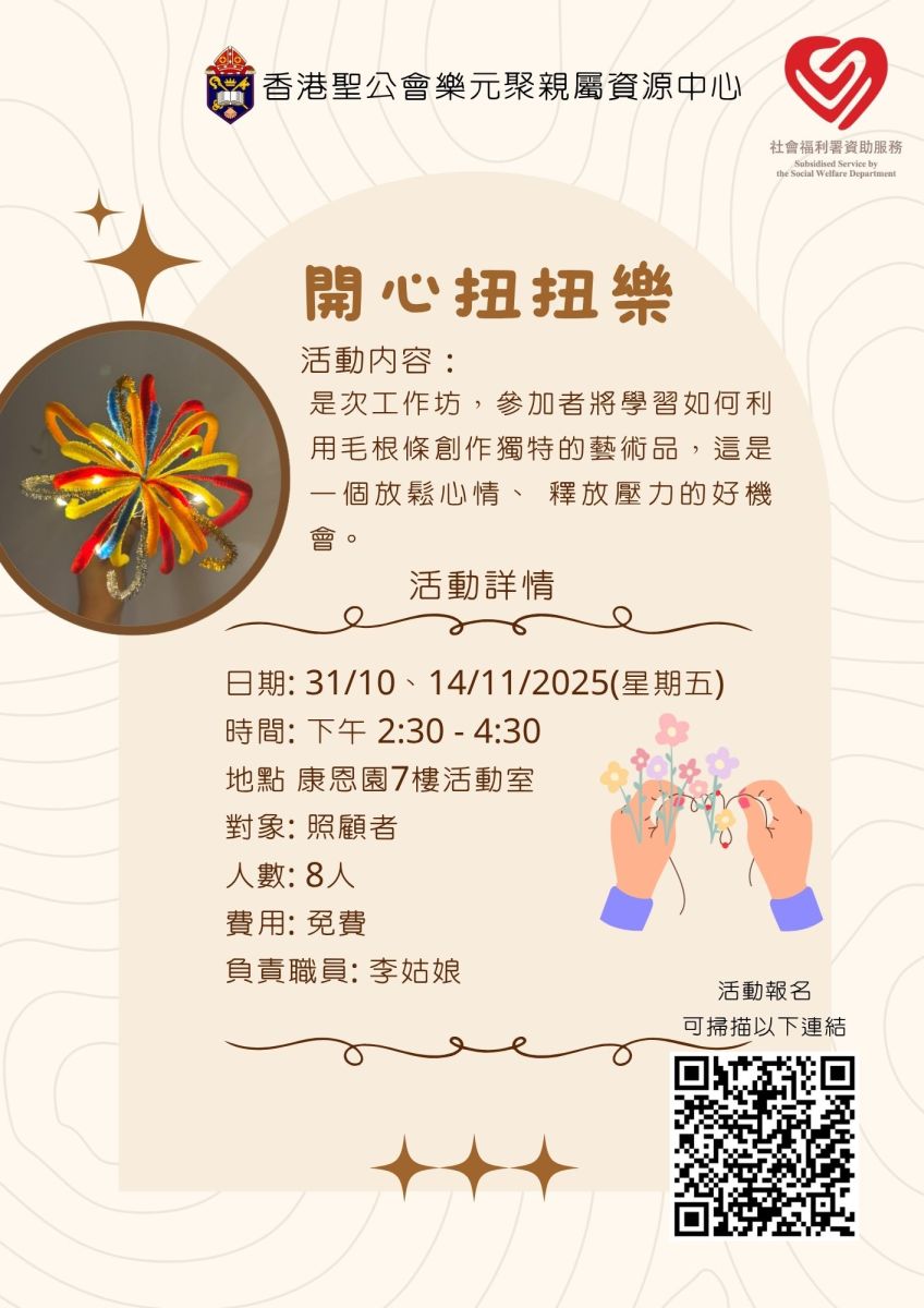 - 是次工作坊,參加者將學習如何利用毛根條創作獨特的藝術品,這是一個放鬆心情、 釋放壓力的好機會。