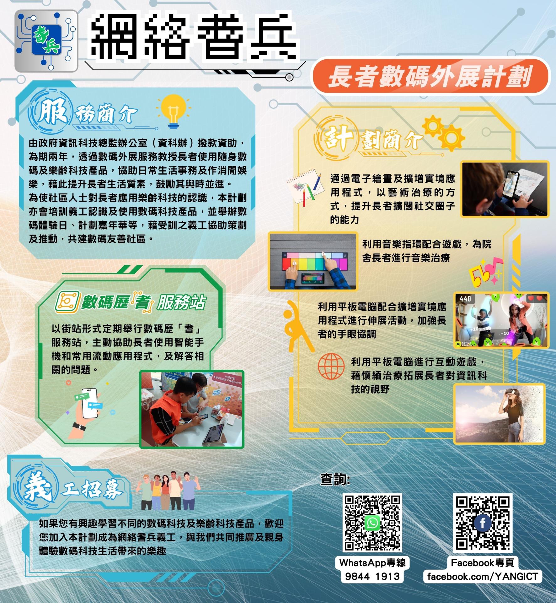 「網絡耆兵」長者數碼外展計劃由政府資訊科技總監辦公室(資科辦)撥款資助,為期兩年(2023-2025年),透過數碼外展服務教授長者使用隨身數碼及樂齡科技產品,協助日常生活事務及作消閒娛樂,藉此提升長者生活質素,鼓勵其與時並進。